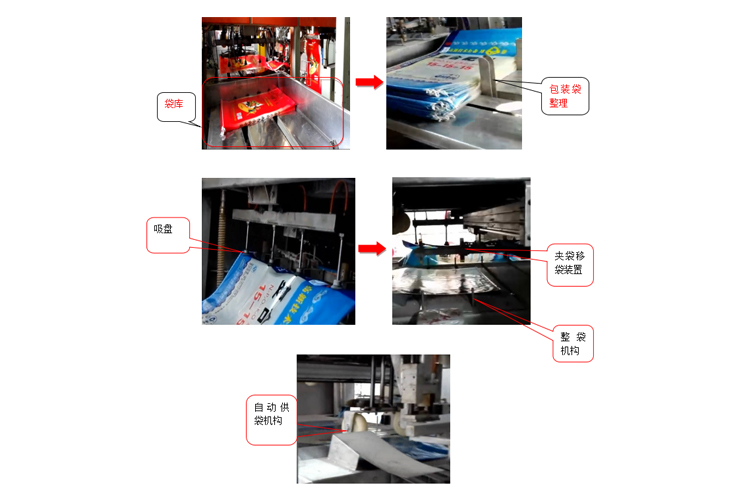 1.將包裝袋放入袋庫,袋庫自動將包裝袋進(jìn)行整理,一排包裝袋上完以后自動將第二排推出,依次將第三排推出,袋庫中包裝袋不足時系統(tǒng)自動報警,提示添加包裝袋。