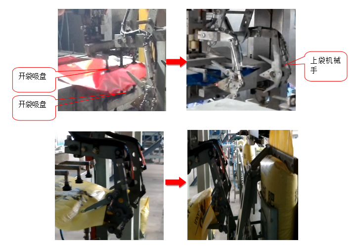 上袋裝置中開袋吸盤從包裝袋口上下兩個方向同時將包裝袋口吸開,上袋機械手伸入袋口內(nèi),將袋的上下兩面同時夾住,彎曲機械臂將包裝袋套到定量包裝秤下料口,過程結(jié)束。