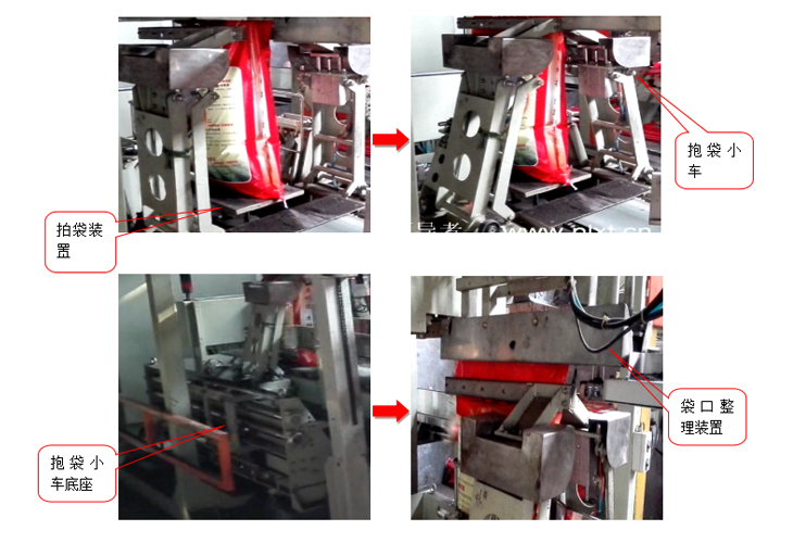 定量包裝機下料灌裝的過程中,底部的拍袋裝置啟動,確保袋內(nèi)物料充填緊密。灌裝結(jié)束后拍打停止,下料口夾袋裝置打開,充填物料后的包裝袋在下料口放下的同時,由送包小車經(jīng)專門加工的用于粉體、顆粒物料料袋的抱包、夾包裝置將料袋中部抱住,袋口夾住,送至活動導(dǎo)入裝置,活動導(dǎo)入與熱合縫包一體機系統(tǒng)相連.經(jīng)其進(jìn)入封口傳動鏈中,保證袋口成一字形。在導(dǎo)入器附近增加吸塵口,通過與除塵系統(tǒng)連接可吸走夾住袋口時飛出的粉塵.